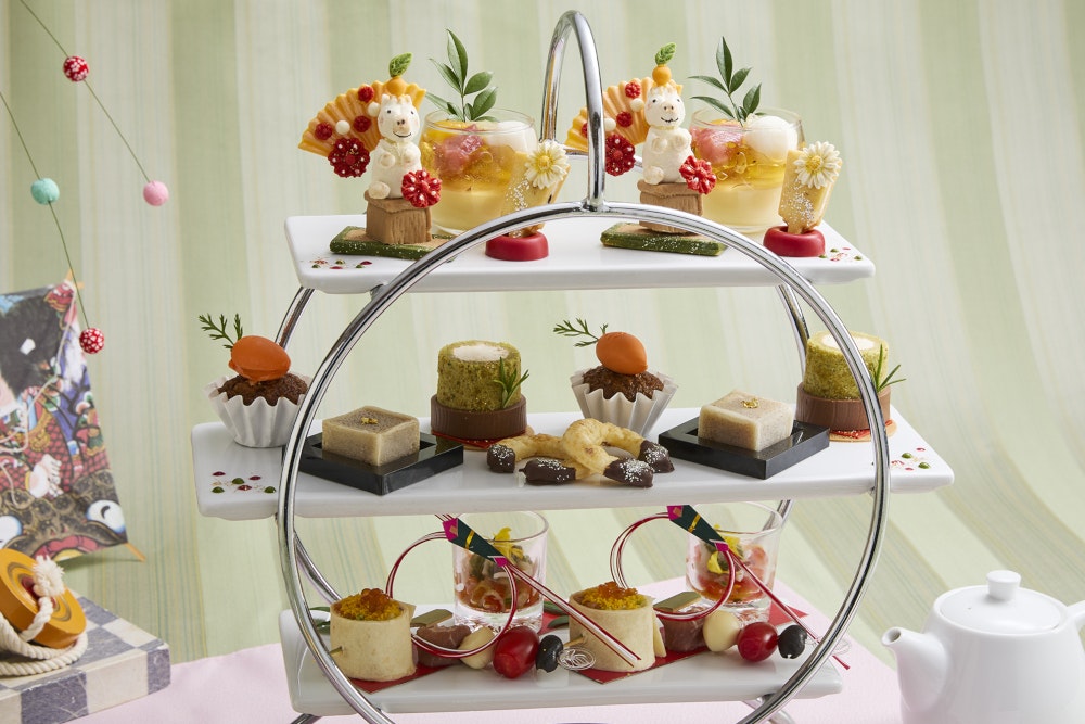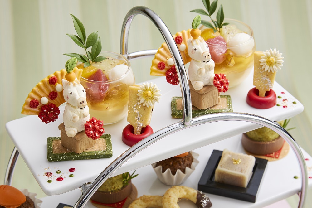 かわいらしい白馬のチョコレート細工や幸運のお守りともいわれる馬の蹄鉄に見立てたオニオンパイなど、午年にちなんだスイーツやお正月をイメージした和スイーツがラインナップ。この時期だけのアフタヌーンティーをぜひご堪能ください。
