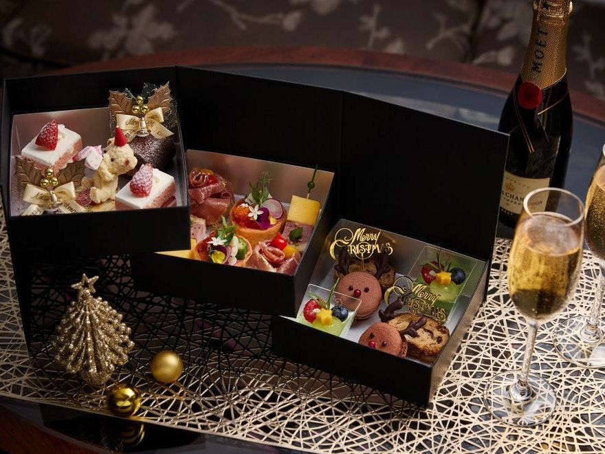 クリスマスはシャンパンと「セイボリー&スイーツの3段BOX」で優雅な夜を。窓に広がる東京の夜景を眺めながら、お部屋でゆったりと素敵なひとときをお過ごしください。