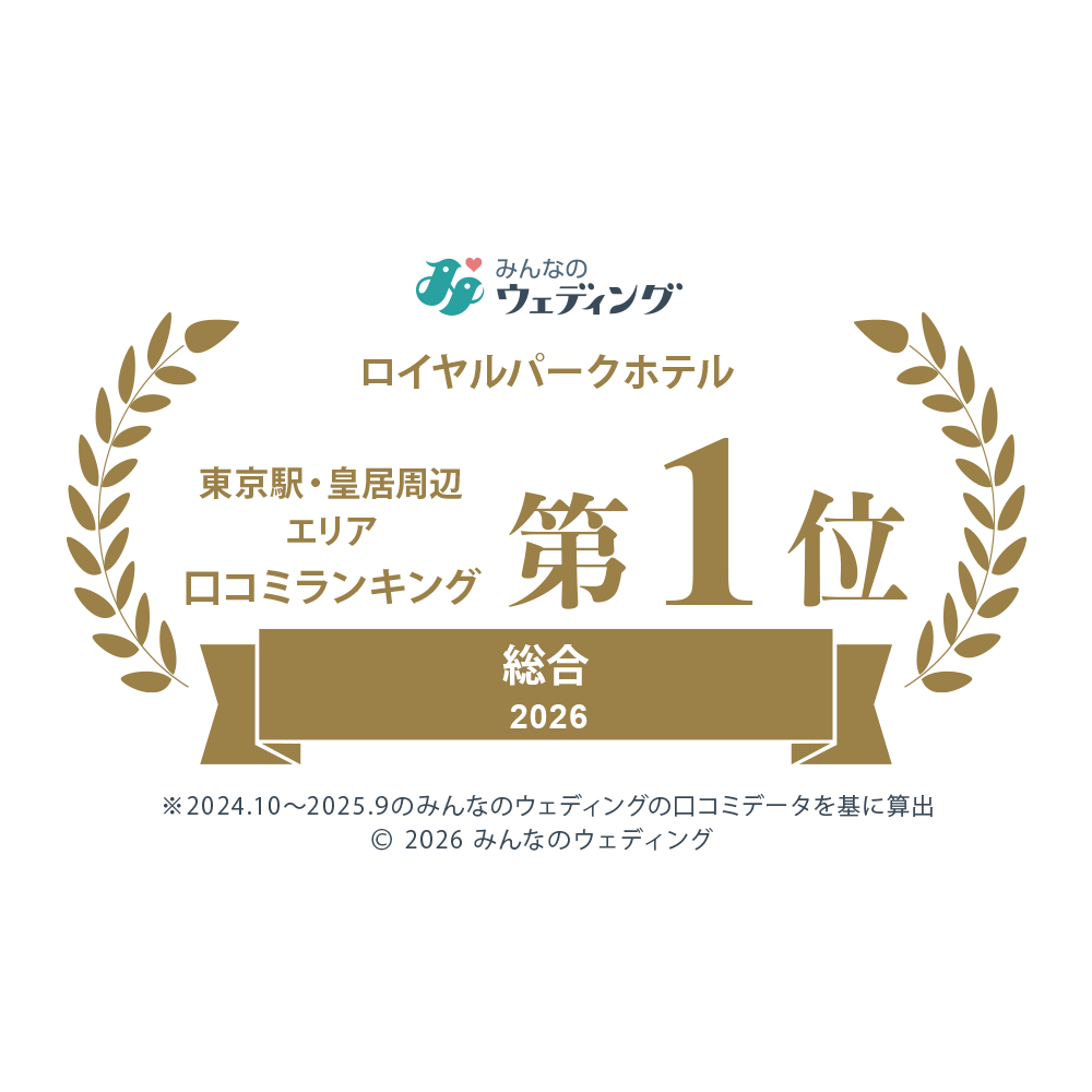 2026年みんなのウェディング口コミランキングで、ロイヤルパークホテルは新郎新婦や招待ゲストから高い評価を得て《 東京駅・皇居周辺エリア 総合1位 》に輝きました!